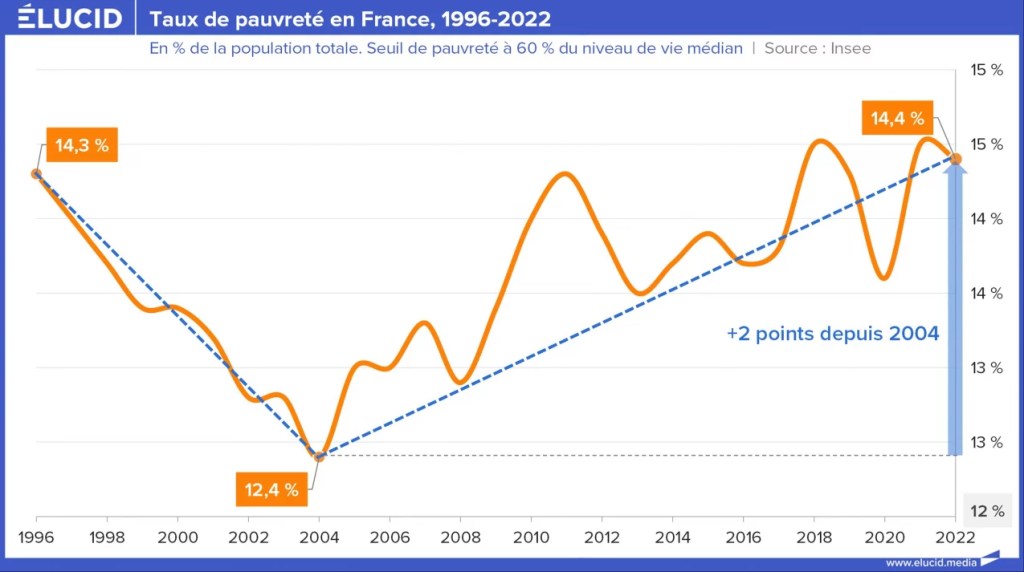 C’est la dernière étude de l’Insee sur la pauvreté qui le rapporte : en 2022, presque 15 % de la population vit sous le seuil de pauvreté. Stable depuis 2018, il se situe tout de même à un niveau parmi les plus élevés observés depuis le milieu des années 1990. Depuis cette époque, le taux de pauvreté s’inscrit dans une fourchette comprise entre 12,4 % et 14,5 %. En 2022, ce sont ainsi 28 000 personnes qui sont venues grossir les rangs des plus de 9 millions de personnes pauvres en France.