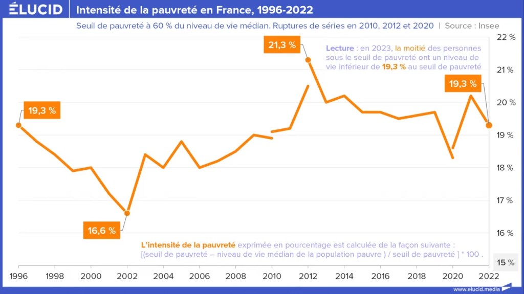 Signe d’une dégradation de la situation, l’intensité de la pauvreté, soit l’écart relatif entre le niveau de vie médian de la population pauvre et le seuil de pauvreté, est sur les plus hauts depuis 1996. Avec une intensité de presque 20 % en 2022, la moitié des personnes pauvres a un niveau de vie inférieur à 980 euros par mois (20 % de moins que le seuil de pauvreté monétaire).