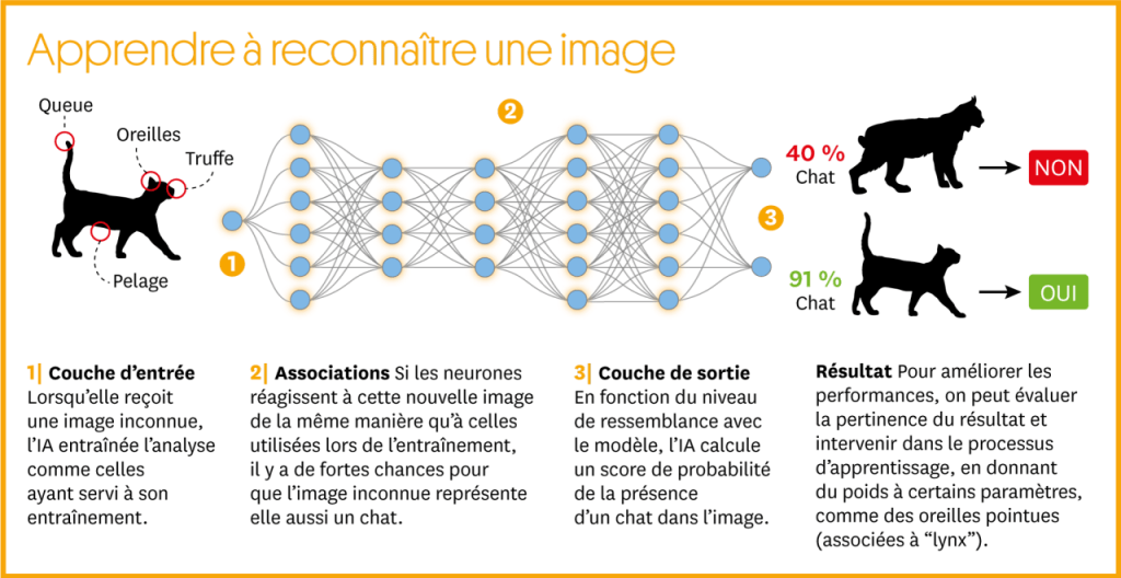 Les méthodes d’apprentissage automatique les plus avancées utilisent des réseaux neuronaux : des systèmes inspirés de la structure du cerveau. Ils simulent des couches de neurones qui traitent les informations lorsqu’elles sont transmises d’une couche à l’autre. Comme dans le cerveau humain, ces réseaux fortifient et affaiblissent les connexions neuronales à mesure qu’ils apprennent, mais on comprend mal pourquoi certaines connexions sont activées plutôt que d’autres. C’est pourquoi les chercheurs parlent souvent de “boîtes noires” pour désigner des systèmes d’IA dont le fonctionnement interne reste un mystère.