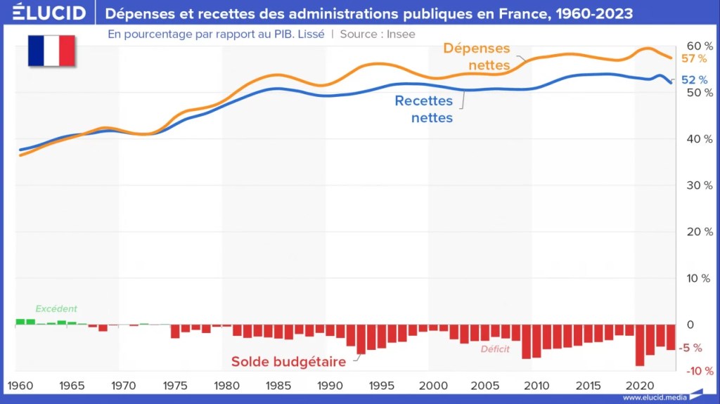 Ainsi, en 2023, face à des dépenses publiques représentant 57 % du PIB, le gouvernement a décidé de n’appeler que 52 % du PIB en recettes. Cette gestion lamentable a donc généré un gigantesque déficit de 5 % du PIB, soit près de 150 milliards d’euros. Les taux d’intérêt étant actuellement de plus de 3 %, cela va représenter, pour des décennies, une charge annuelle supplémentaire d’intérêts de 4 Md€ par an, soit un montant supérieur au budget total de la Culture par exemple. Juste pour le déficit de 2023 donc…