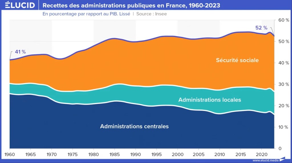 Au niveau de la structure des recettes, on retrouve sans surprise le même mouvement précédemment décrit pour les dépenses : forte hausse des recettes de la Sécurité sociale et stagnation des recettes d’administration, avec à l’intérieur une forte hausse des recettes des collectivités locales (communes, départements, régions…) et une nette baisse des recettes de l’État. Cela signifie donc que la majorité des recettes publiques est destinée à être immédiatement redistribuée sous forme de retraites par exemple, et non pas, comme veut le faire croire la propagande, à une « armée mexicaine » de fonctionnaires.