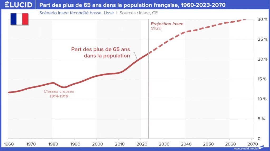 Les seuls prélèvements obligatoires se sont élevés à 43 % du PIB en 2023. Ce taux n’est qu’en légère baisse par rapport à 2022, et il reste proche du record historique en France, malgré des décennies de politiques néolibérales. Ceci est en réalité causé par la poursuite des inévitables effets du vieillissement de la population.