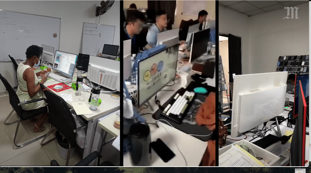 A son arrivée à Bangkok, la Kényane s’attend à rejoindre une entreprise de commerce en ligne. « Un homme au volant d’un van m’a récupérée, il a conduit le lendemain pendant de longues heures, on a traversé une rivière en bateau. A ce moment-là, je ne me doutais de rien, je me croyais encore en Thaïlande », raconte-t-elle. Elle est en fait passée au Laos. Selon le récit qu’elle donne de ce périple, des inconnus la conduisent alors dans l’un des milliers de complexes dévolus à la fraude en ligne. A l’intérieur, on trouve des open spaces où sont installés les centres d’arnaque et des dortoirs où sont logés les travailleurs.