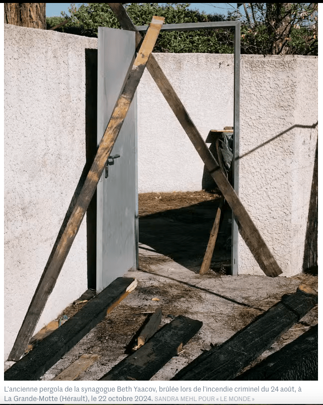 Deux mois n’ont pas suffi à chasser l’odeur de brûlé qui se dégage encore des poutres en bois noircies par les flammes. Les deux tiers de la pergola de la cour extérieure de la synagogue Beth Yaacov à La Grande-Motte (Hérault) sont partis en fumée, le 24 août. Ce jour-là, un Algérien de 33 ans, résidant à Nîmes, armé de bidons d’essence et d’une hache recouverte d’inscriptions relatives à la Palestine, a commencé à mettre le feu à l’établissement religieux, qui porte toujours les stigmates de l’attentat.