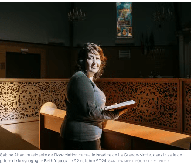 Sabine Atlan, présidente de l’Association cultuelle israélite de La Grande-Motte, dans la salle de prière de la synagogue Beth Yaacov, le 22 octobre 2024. SANDRA MEHL POUR « LE MONDE »