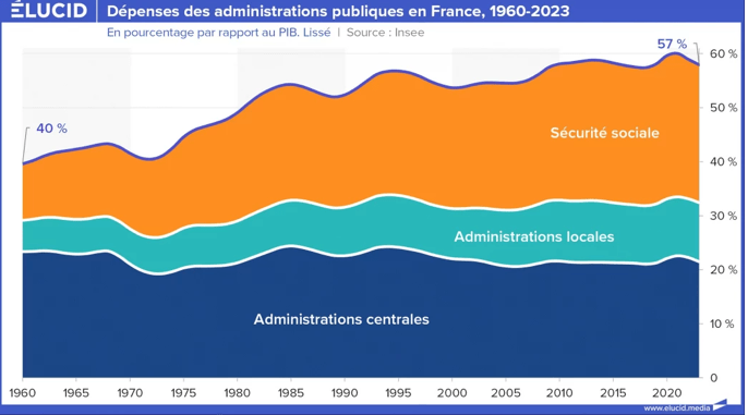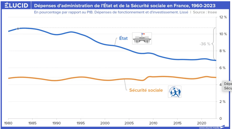 Au final, les dépenses d’administration de l’État en proportion du PIB ont fondu de -35 % au cours des quarante dernières années, ce qui explique la déliquescence de nos services publics.