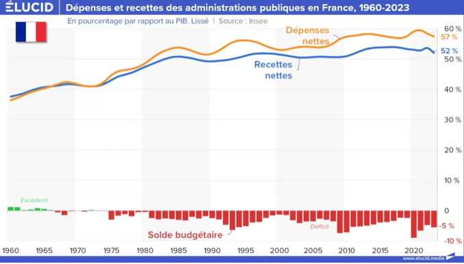 Ainsi, en 2023, face à des dépenses publiques représentant 57 % du PIB, le gouvernement a décidé de n’appeler que 52 % du PIB en recettes. Cette gestion lamentable a donc généré un gigantesque déficit de 5 % du PIB, soit près de 150 milliards d’euros. Les taux d’intérêt étant actuellement de plus de 3 %, cela va représenter, pour des décennies, une charge annuelle supplémentaire d’intérêts de 4 Md€ par an, soit un montant supérieur au budget total de la Culture par exemple. Juste pour le déficit de 2023 donc…
