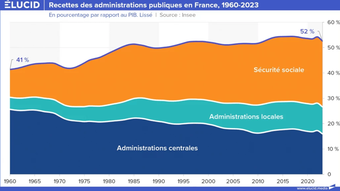 Au niveau de la structure des recettes, on retrouve sans surprise le même mouvement précédemment décrit pour les dépenses : forte hausse des recettes de la Sécurité sociale et stagnation des recettes d’administration, avec à l’intérieur une forte hausse des recettes des collectivités locales (communes, départements, régions…) et une nette baisse des recettes de l’État. Cela signifie donc que la majorité des recettes publiques est destinée à être immédiatement redistribuée sous forme de retraites par exemple, et non pas, comme veut le faire croire la propagande, à une « armée mexicaine » de fonctionnaires.