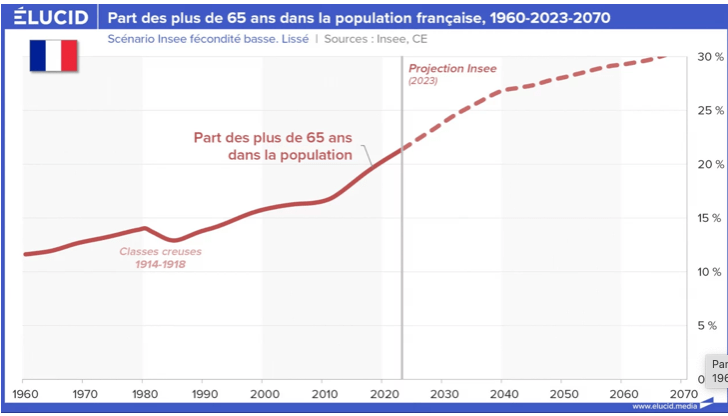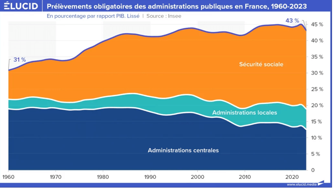 Les seuls prélèvements obligatoires se sont élevés à 43 % du PIB en 2023. Ce taux n’est qu’en légère baisse par rapport à 2022, et il reste proche du record historique en France, malgré des décennies de politiques néolibérales. Ceci est en réalité causé par la poursuite des inévitables effets du vieillissement de la population.