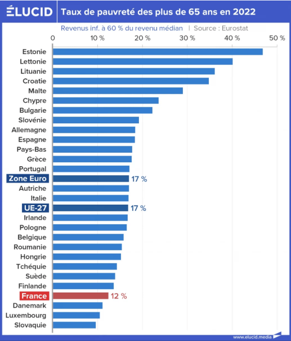 Pourtant, on ne peut évidemment pas vouloir baisser les dépenses publiques sans baisser les transferts publics, et donc le niveau de vie des bénéficiaires. Les dépenses publiques sont parmi les plus élevées en France, mais en contrepartie, le niveau de vie des séniors est équivalent à celui des actifs et donc le taux de pauvreté des retraités français est pratiquement le plus bas d’Europe.