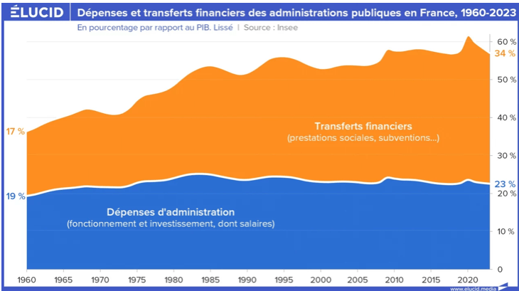 Ainsi, si on veut s’interroger sur le poids des administrations en France, s’intéresser seulement au montant des impôts payés n’a pas grand sens, vu qu’une grande partie correspond à de simples transferts financiers : l’argent payé est reversé aux contribuables, qui en bénéficient soit immédiatement (remboursements médicaux, subvention aux entreprises, aides au logement, bouclier énergie…), soit de manière différée (retraite, chômage, invalidité…).