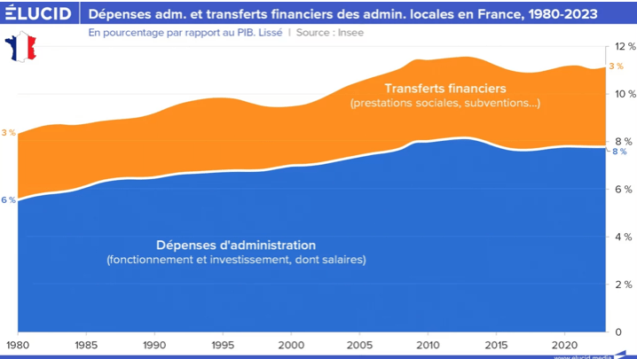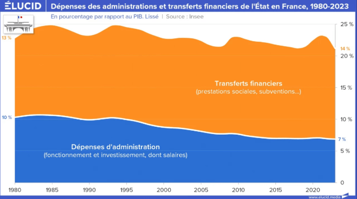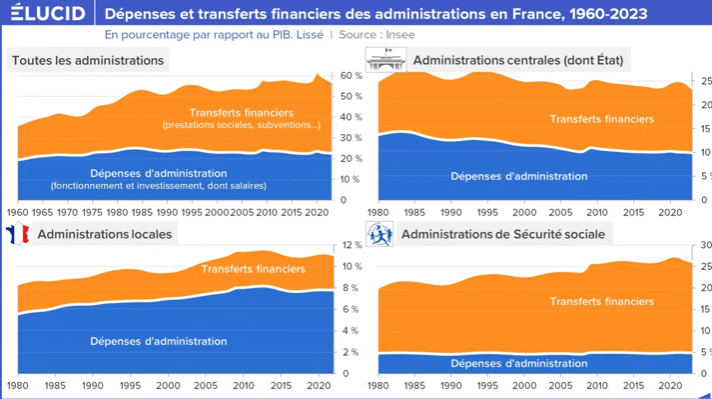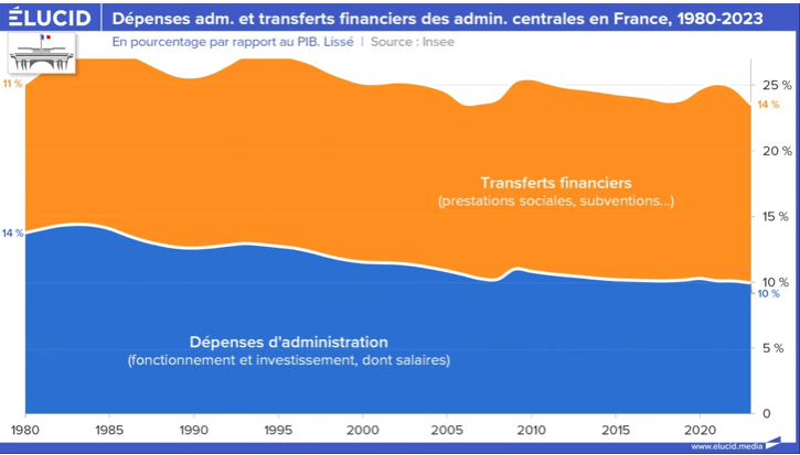 C’est parce que la vérité est tout autre. Si on exclut les collectivités locales, les dépenses d’administration (et donc les impôts correspondants) n’ont eu de cesse de diminuer depuis 40 ans. Mais cela ne s’est pas vu, car les dépenses de transfert n’ont eu de cesse d’augmenter, de plus de 50 %. Et ce essentiellement à cause des effets du vieillissement de la population et, accessoirement, à cause des politiques néolibérales de pillage de l’État au bénéfice des plus aisés.