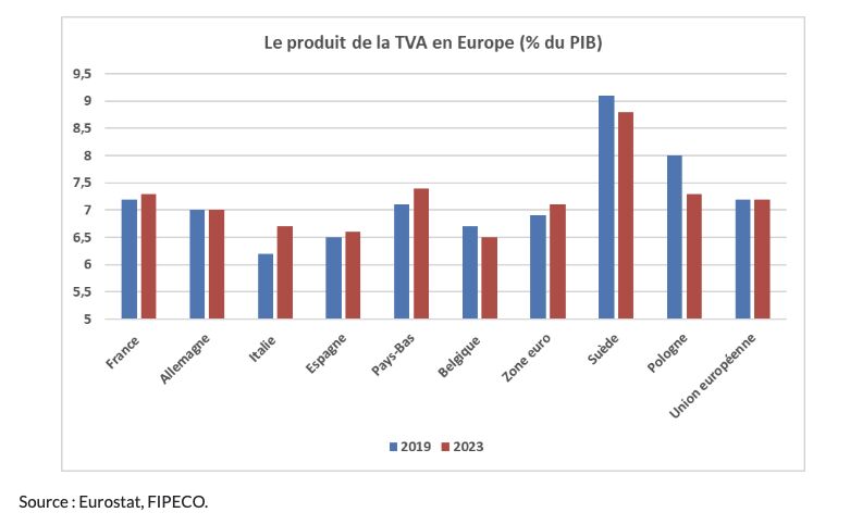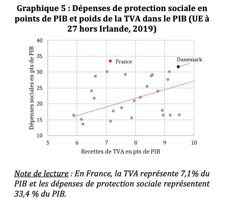 1/ La relative faiblesse du rendement actuel (7,1% PIB) dans le pays avec la part de dépenses sociales la plus élevée au monde (33% du PIB). Là où la dépense sociale est élevée, les rendements à la TVA sont supérieurs à ceux de la France. C’est le cas des pays scandinaves où la TVA est autour de 25%.