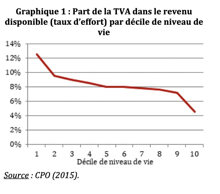 1/ La TVA est un impôt régressif qui pèse plus sur les moins aisés (> 10% de taux d’effort pour les deux premiers déciles et 4% sur le dernier décile), du fait que la part de la consommation dans les revenus est d’autant plus forte que les revenus sont faibles.