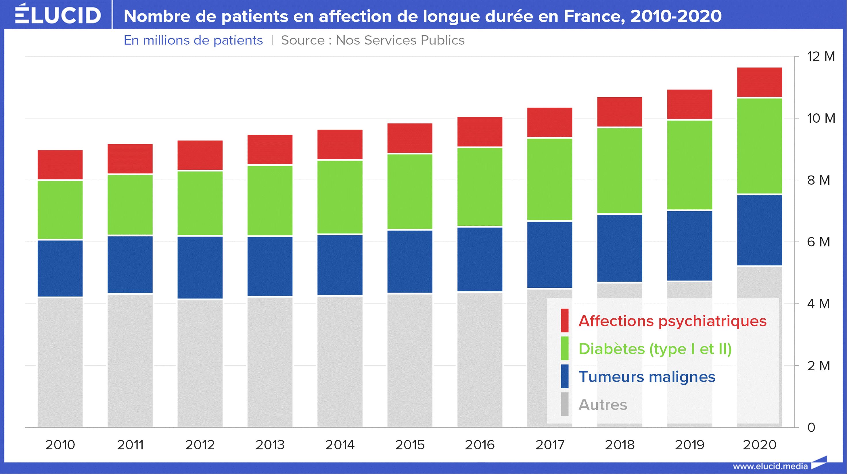 Le collectif Nos Services publics, auteur du « Rapport sur l’état des services publics », note que ce vieillissement de la population, permis par l’amélioration du système de santé, s’accompagne du développement des affections de longue durée (ALD). Ces maladies chroniques, qui sont essentiellement de type cardio-vasculaire ou liées au diabète, aux tumeurs malignes ou encore aux affections psychiatriques, représentent plus de 60 % des dépenses de santé en 2020. En augmentation d’un tiers depuis 2010, elles touchent aujourd’hui 12 millions de personnes avec, selon la gravité, des traitements plus ou moins longs et coûteux.