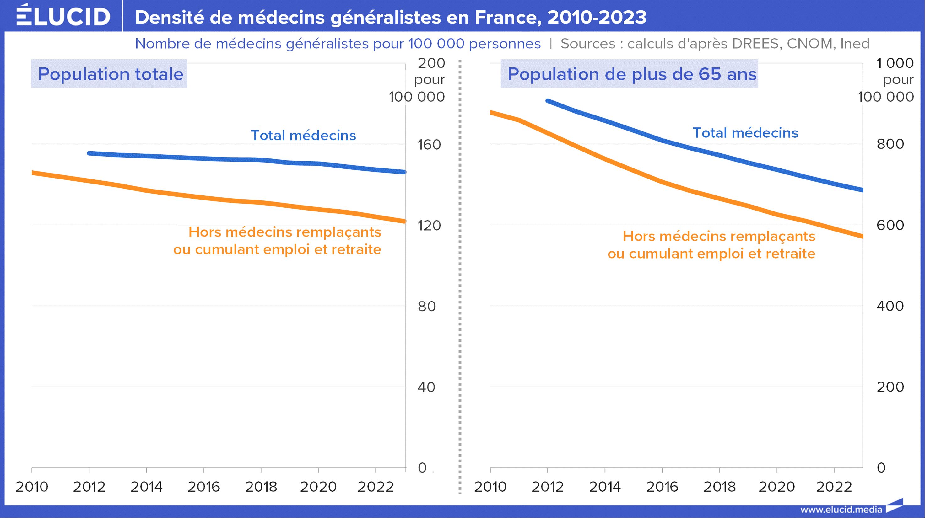 Et encore, ces chiffres incluent les médecins remplaçants, en forte augmentation ces dernières années selon la DREES, et ceux qui cumulent emploi et retraite. En excluant ces deux catégories, selon l’ordre des médecins, la densité de généralistes en activité régulière a baissé de 15 % depuis 2012, et même de presque un tiers par rapport à la population de plus de 65 ans.