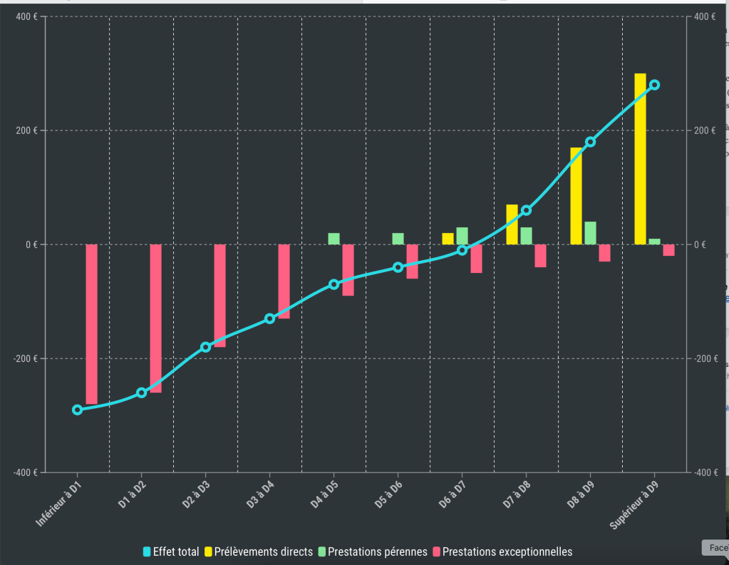 Mais cet effet est loin d’être homogène. La politique socio-fiscale de l’exécutif a fait 19 millions de perdants, c’est-à-dire les deux tiers de l’ensemble des ménages, et 5,7 millions de gagnants. Ainsi, les 70 % des Français les moins riches ont été lésés. Mais c’est pour le 1er dixième de niveau de vie (les 10 % les plus pauvres) que la saignée a été la plus sévère : 290 euros en moyenne par an et par personne, soit une baisse de niveau de vie de 2,7 %.