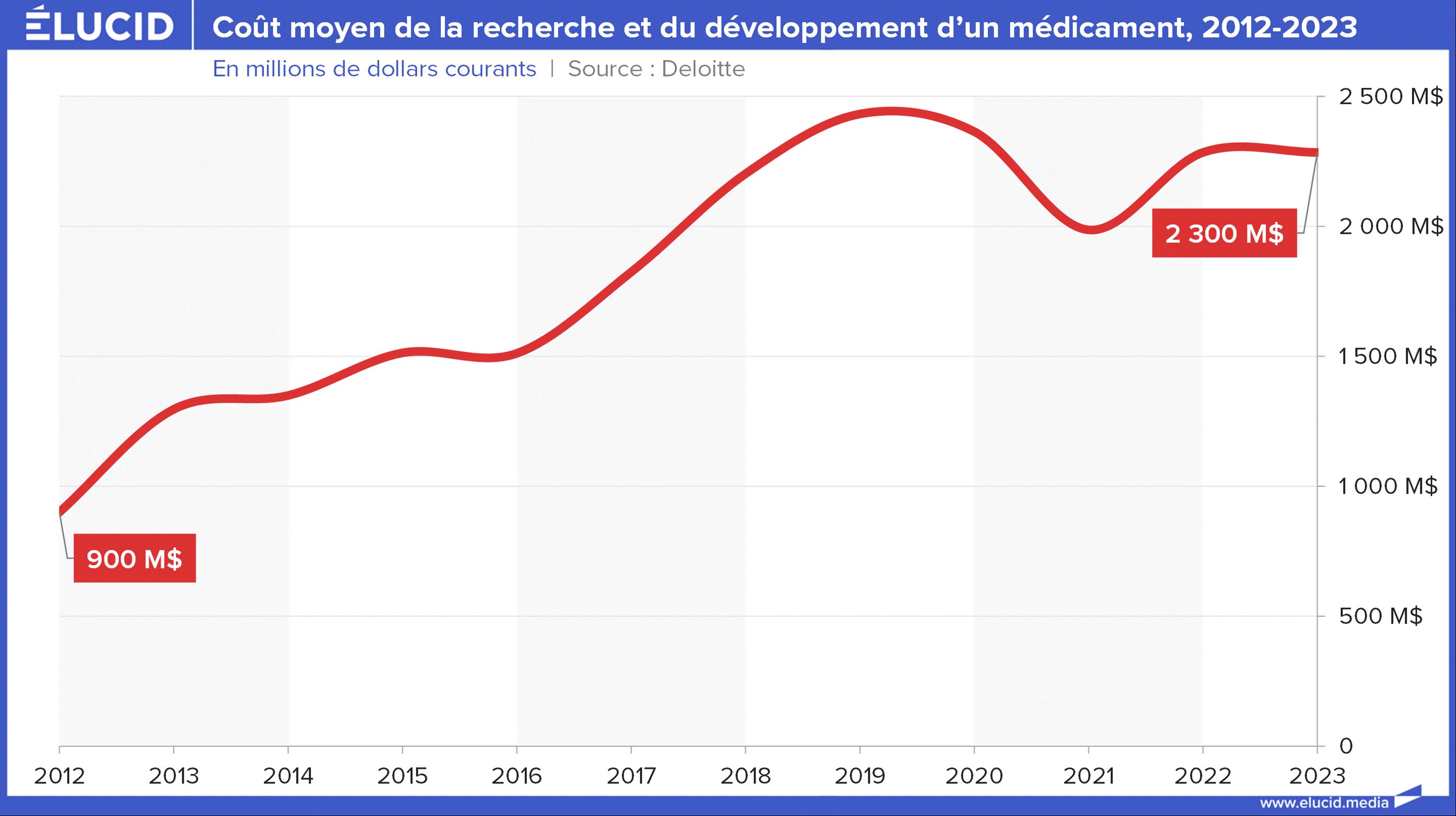 Pour les entreprises pharmaceutiques, la nécessité de dégager des marges est même particulièrement impérative, car cette industrie demande des investissements lourds et permanents dans la recherche et développement. Ceux-ci représentent 13 % du chiffre d’affaires du secteur du médicament au niveau mondial – plus que dans tout autre domaine industriel –, 10 % en France. Le coût moyen de développement d’un nouveau médicament ne cesse de croître : entre 2012 et 2022, il est ainsi passé de 900 millions à 2,3 milliards de dollars, entre autres parce que la recherche se concentre sur des technologies de plus en plus pointues.