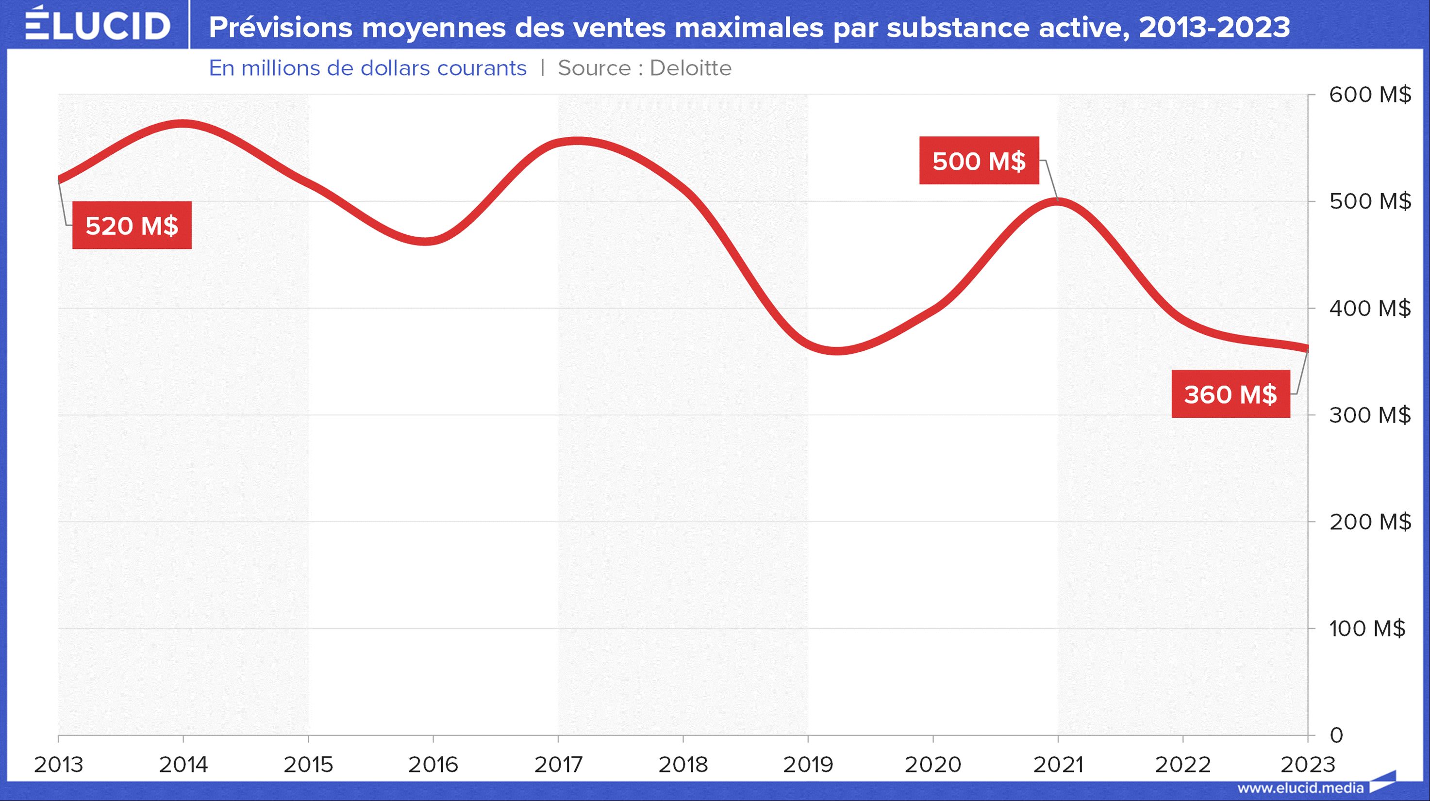 Parallèlement, le pic de chiffre d’affaires prévisionnel par substance active suit une tendance à la baisse, malgré un rebond en 2021 dû au boom des vaccins anticovid : de 520 millions de dollars en 2013, il n’est plus que de 362 millions en 2023.