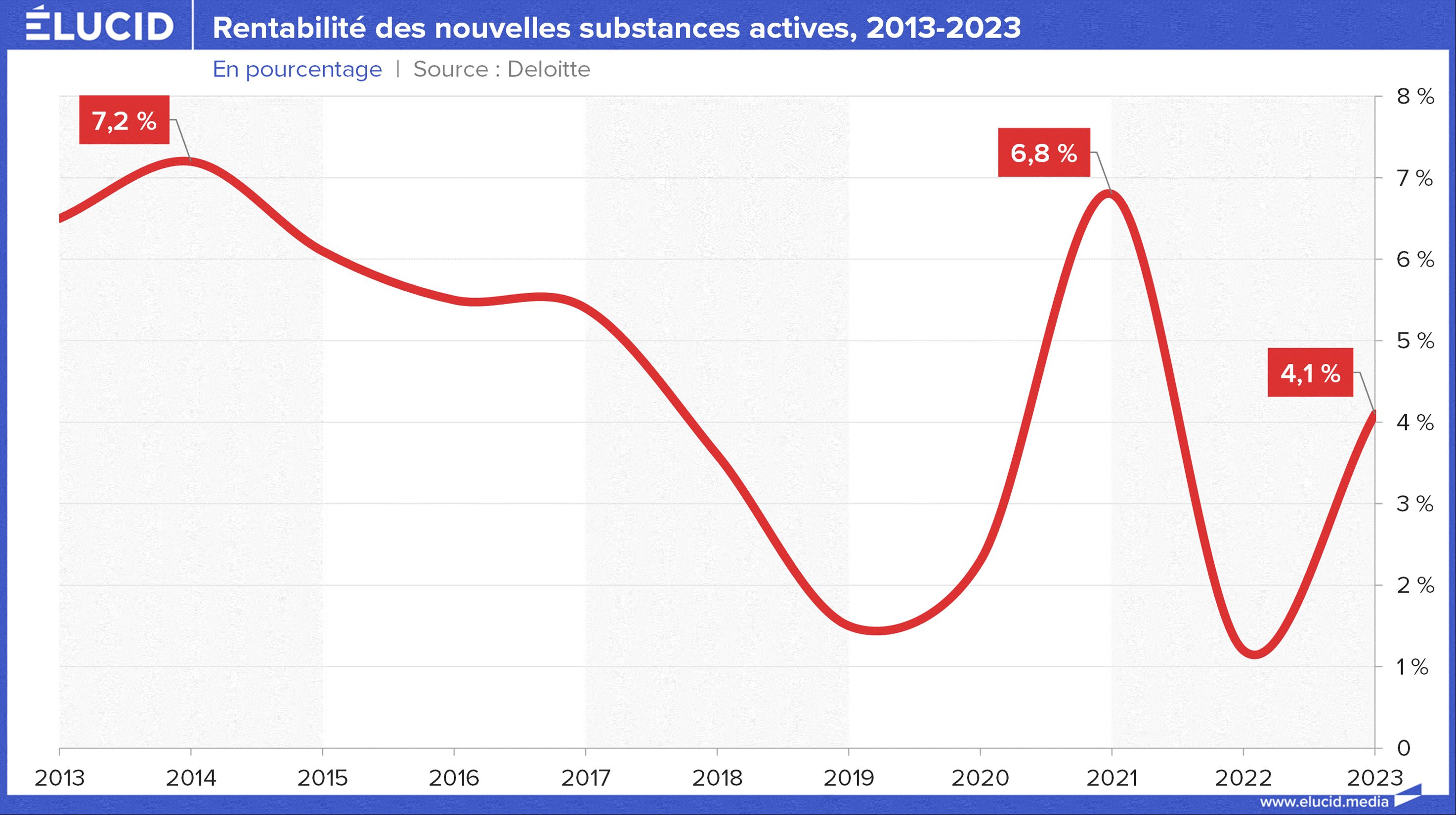 Ainsi, la rentabilité de la recherche et développement dans le secteur du médicament n’a cessé de baisser depuis 2010, hormis un rebond en 2020 et 2021, lié au covid ; malgré une relative amélioration en 2023, la tendance à la baisse devrait être durable. Elle repose sur des facteurs structurels : on a déjà mentionné le déplacement de la recherche vers des domaines de plus en plus pointus, responsable de l’augmentation du coût moyen de développement d’une nouvelle molécule ; mais l’action du législateur n’est pas la dernière cause de cette crise des rendements.