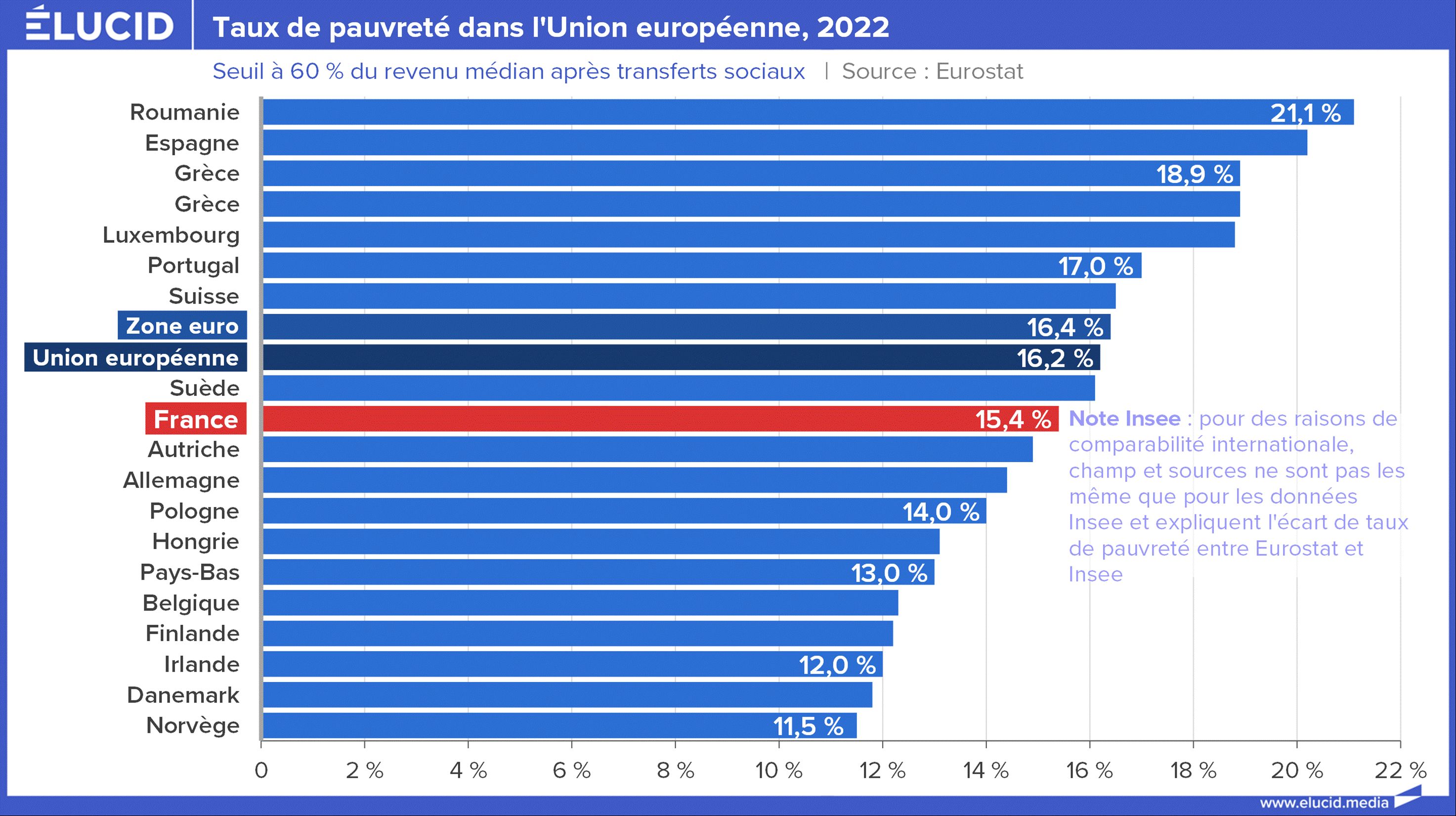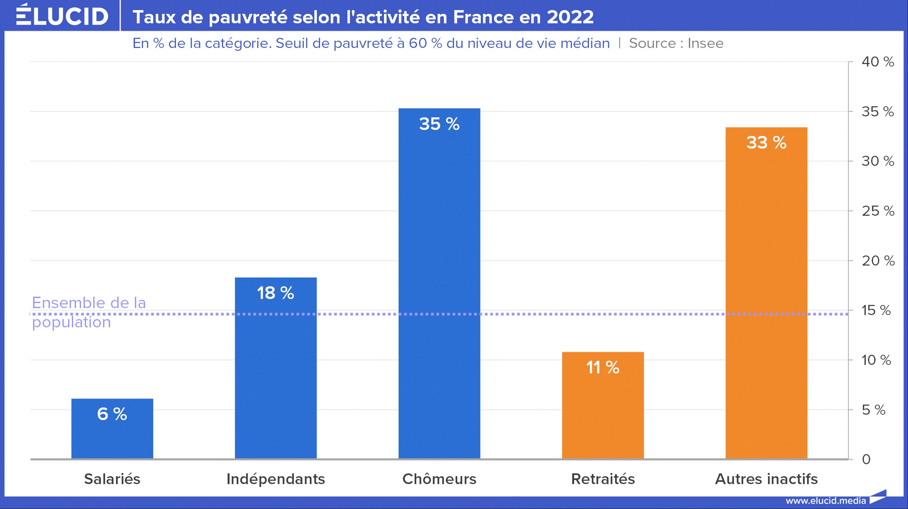 Pour l’Insee, un individu ou un ménage est considéré comme pauvre lorsque son revenu est inférieur à un certain seuil de niveau de vie. En France et en Europe, ce seuil est le plus souvent fixé à 60 % du niveau de vie médian (les seuils de 40 % ou 50 % peuvent aussi être aussi utilisés). Il est décliné pour les ménages en fonction de leur composition. En France, c’est par exemple 1 216 euros par mois pour un célibataire ou 2 190 euros par mois pour un couple avec un enfant de moins de 14 ans. En 2022, 14,4 % de la population de France métropolitaine vivait sous le seuil de pauvreté.