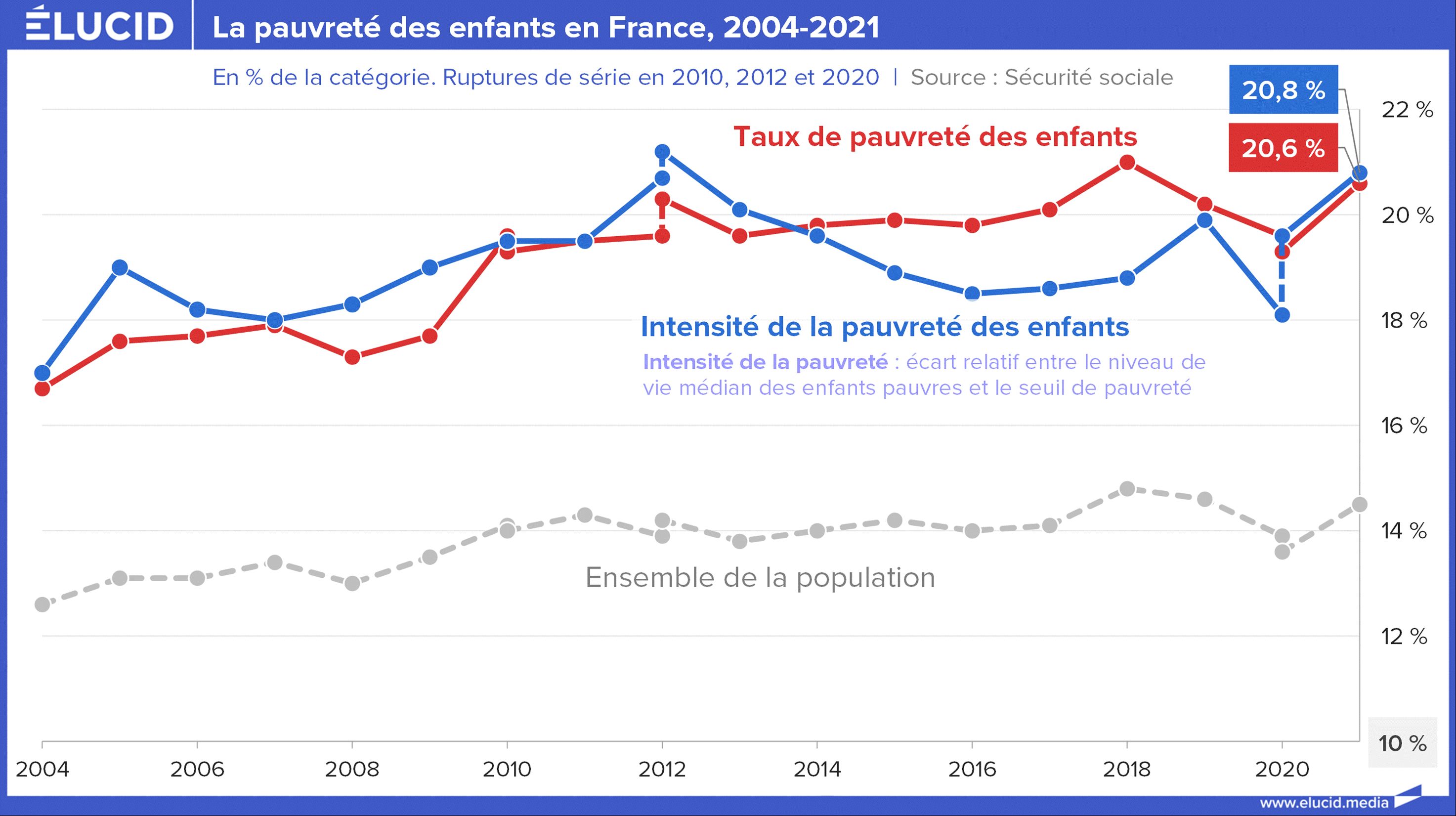 L’intensité de la pauvreté des enfants est non seulement plus forte que pour l’ensemble de la population, mais augmente aussi plus vite. En 2021, la moitié des enfants vivant dans des ménages en situation de pauvreté affichait un niveau de vie inférieur de 20 % au seuil de pauvreté.