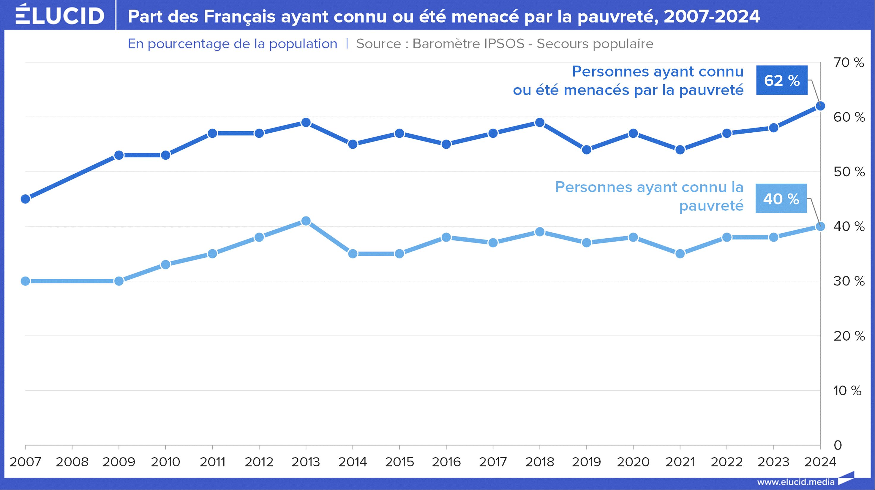 Près des deux tiers des Français déclarent avoir été touchés ou menacés par la pauvreté, dont huit ouvriers sur dix et sept personnes sur dix vivant en zones rurales ou avec un enfant.