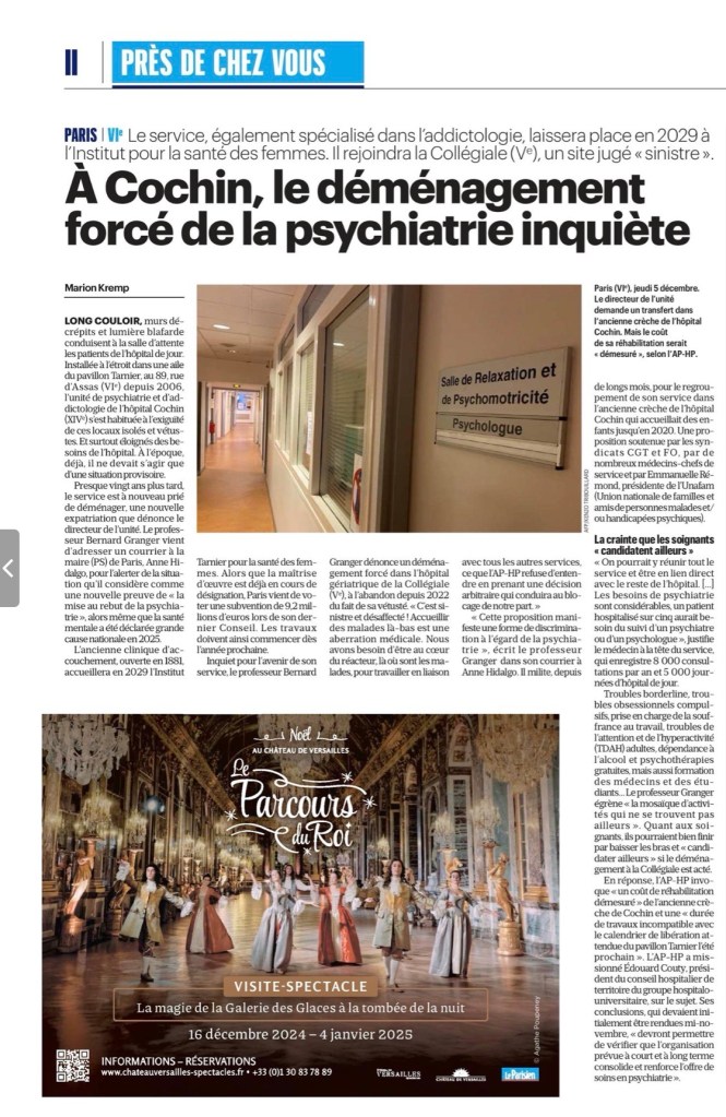 La journaliste indique que « le service est à nouveau prié de déménager, une nouvelle expatriation que dénonce le directeur de l’unité. Le Pr Bernard Granger vient d’adresser un courrier à la maire (PS) de Paris, Anne Hidalgo, pour l’alerter de la situation qu’il considère comme une nouvelle preuve de «la mise au rebut de la psychiatrie», alors même que la santé mentale a été déclarée grande cause nationale en 2025 ».
