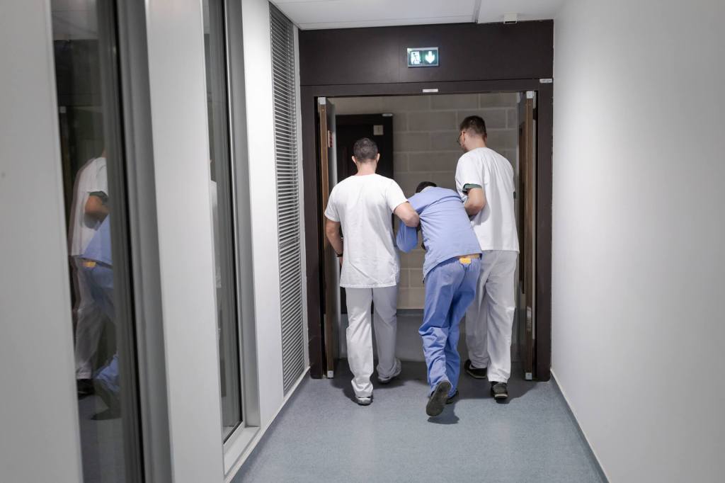 L’équipe soignante du soir accompagne les patients en salle d’isolement à l’unité de soins intensifs psychiatriques du centre hospitalier universitaire de Montpellier, le 26 novembre 2024. LAURENCE GEAI/MYOP POUR « LE MONDE »