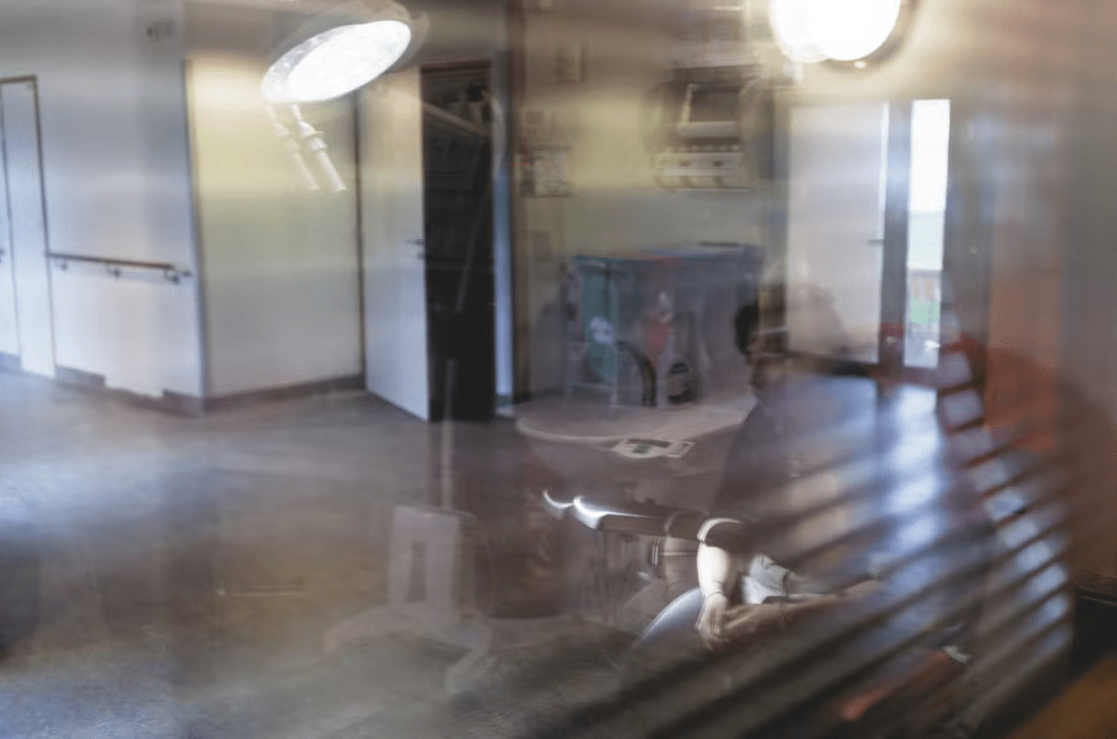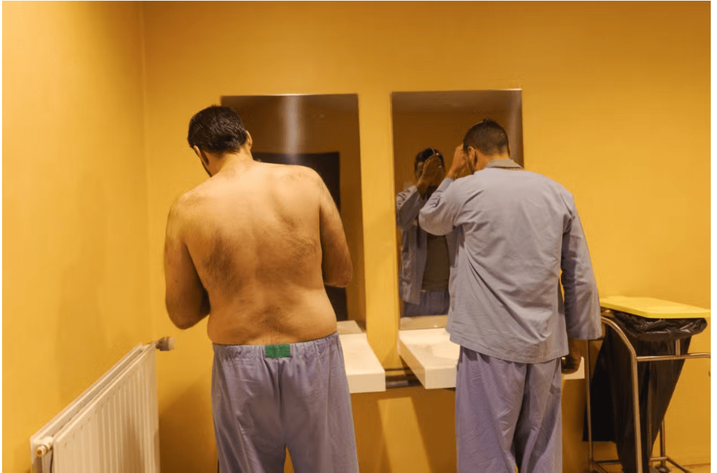 ans la salle de bains commune de l’unité de soins intensifs psychiatriques du centre hospitalier universitaire de Montpellier, le 27 novembre 2024. LAURENCE GEAI/MYOP POUR « LE MONDE