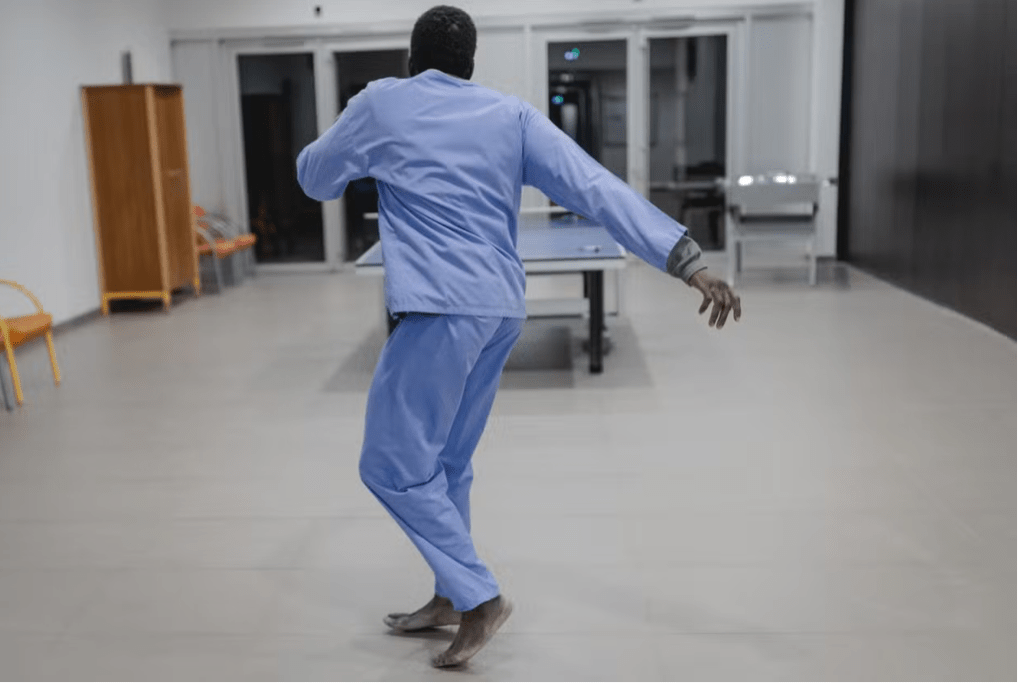 Un patient danse dans la salle commune de l’unité de soins intensifs psychiatriques du centre hospitalier universitaire de Montpellier, le 26 novembre 2024. LAURENCE GEAI/MYOP POUR « LE MONDE »