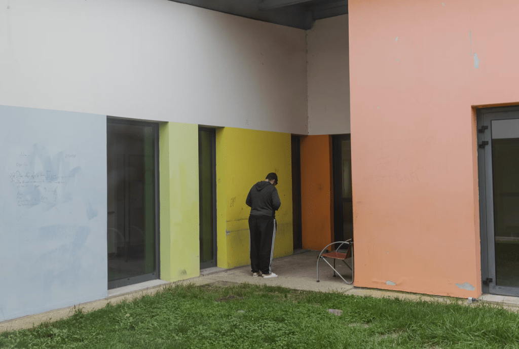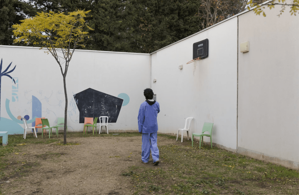 Un patient dans la cour de l’unité de soins intensifs en psychiatrie du CHU de Montpellier, le 26 novembre 2024. LAURENCE GEAI/MYOP POUR « LE MONDE »