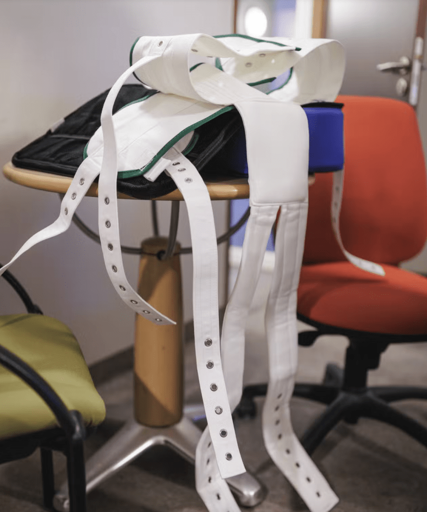 Matériel de contention, à l’hôpital François-Quesnay, à Matériel de contention, à l’hôpital François-Quesnay, à Mantes-la-Jolie (Yvelines), le 6 novembre 2024. Son usage a été fortement réduit dans ce service. LAURENCE GEAI/MYOP POUR « LE MONDE »