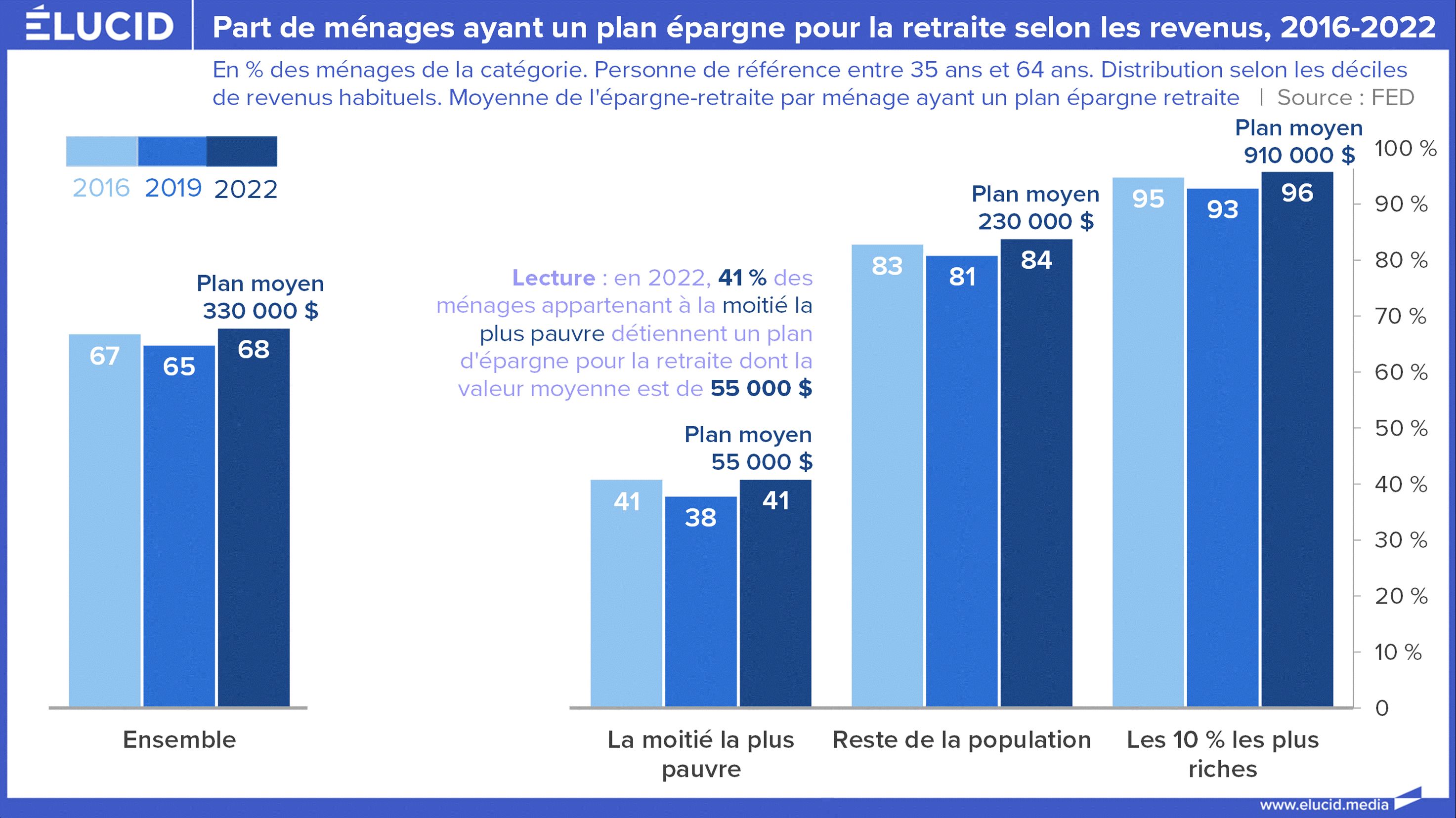 Malgré une retraite par capitalisation et les performances boursières, le taux de pauvreté (2) des plus de 65 ans est de plus de 30 % aux États-Unis, selon l’OCDE, à comparer au moins de 13 % de la France. Rien de bien surprenant vu les statistiques de détention des placements financiers et une situation qui n’est pas prête de s’arranger. Parmi les futurs retraités américains de 35 à 64 ans, ceux qui ont fini leurs études et ne sont pas encore à la retraite, 6 sur 10 de la moitié la plus pauvre n’ont pas de plan d’épargne retraite. En contraste, chez la moitié la plus riche, ils sont plus de 8 sur 10 à alimenter un plan d’épargne retraite.