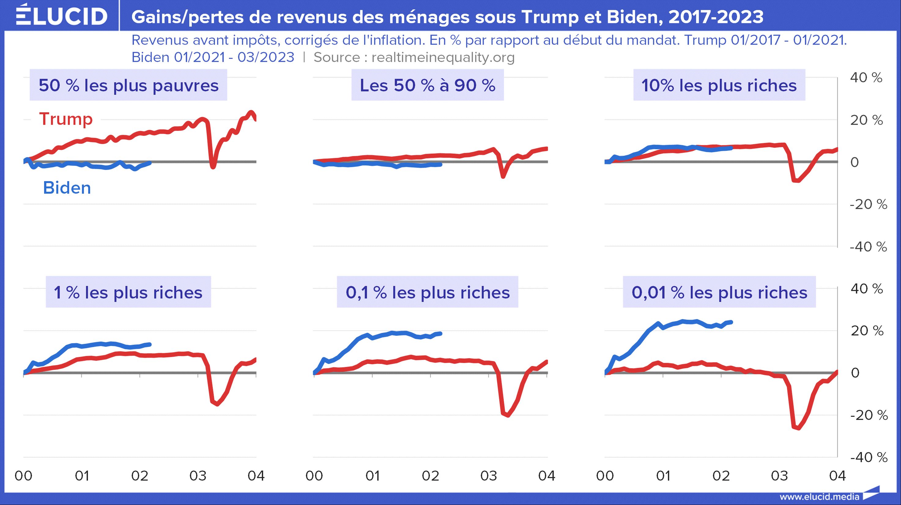 Aux États-Unis, les inégalités sont profondes et toujours plus importantes. La bourse ne profite qu’à une poignée de riches, la croissance est tirée par des dépenses de santé au plus haut et s’accompagne de création d’emplois précaires. Avec la forte inflation, neuf Américains sur dix n’ont pas vu leurs revenus augmenter sous Biden. Pire, les seuls gagnants sont dans le top 10 %, notamment grâce à l’envolée boursière qui a suivi la période Covid.