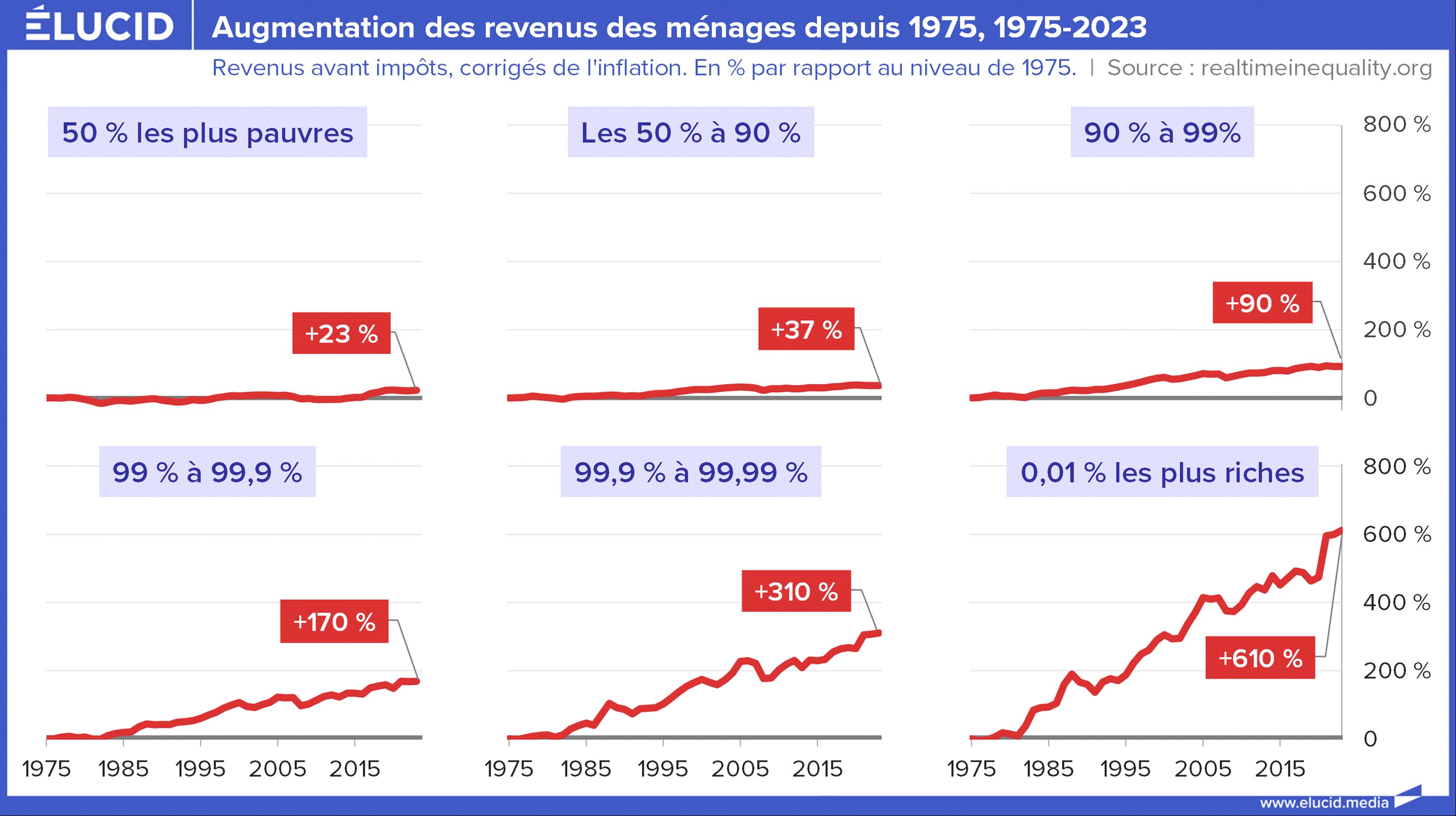 Les principaux bénéficiaires depuis 50 ans sont les membres du dixième les plus riches. Et plus ils sont riches, plus ils ont capté de revenus. Pendant que les membres du 90 %-99 % – le top 10 % sauf le dernier 1 % – ont vu leurs revenus multipliés par deux en un demi-siècle, ceux du 99 %-99,9 % – le top 1 % sauf le dernier 0,1 % – les ont vu multipliés par presque trois.