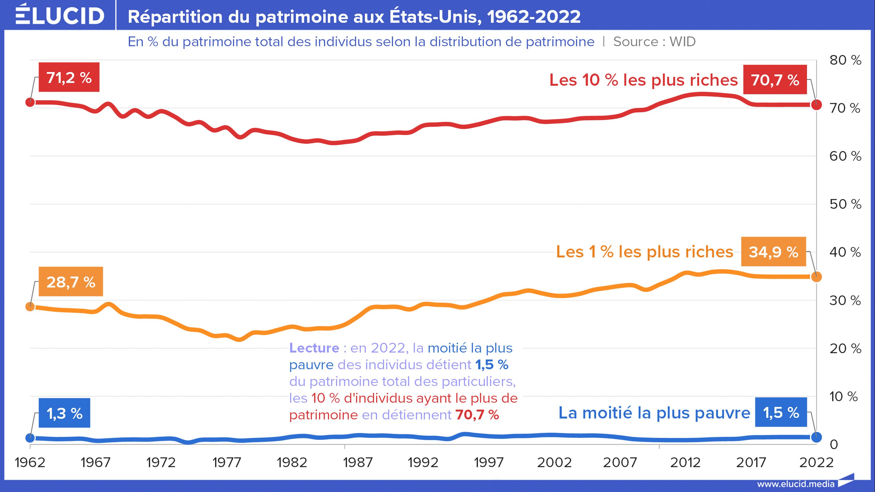 Cet accaparement des revenus se traduit en concentration des patrimoines vers le haut, avec les 1 % des Américains les plus riches qui détiennent plus d’un tiers du patrimoine des particuliers… En élargissant au top 10 % des Américains, ils en détiennent presque les trois quarts. À l’autre bout du spectre, les 50 % les plus pauvres n’en possèdent que 1,5 %… une situation qui a peu évolué depuis les années 1960, alors que le rêve américain est souvent brandi par les promoteurs de la méritocratie…
