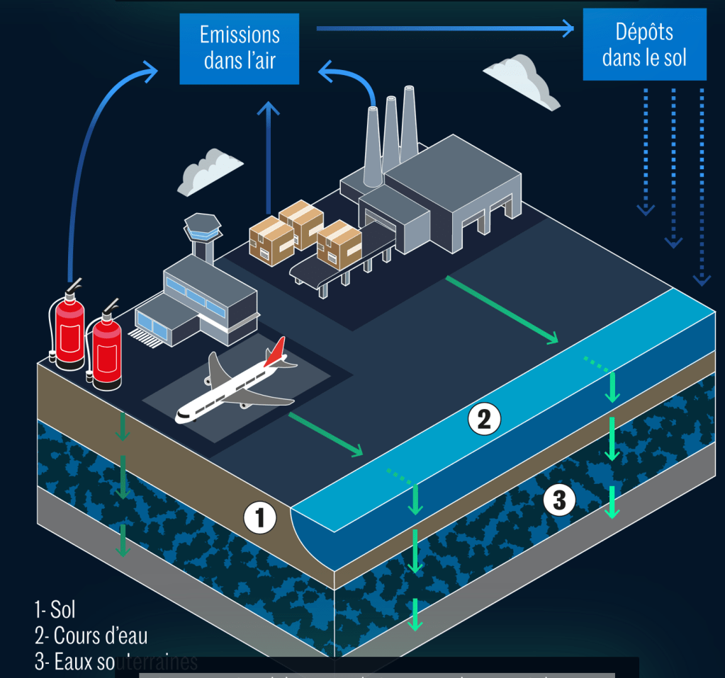 Les aéroports, les bases militaires et les centres d’entraînement à la lutte contre les feux d’hydrocarbures, contaminés par l’usage de mousses anti-incendie contenant des PFAS, les diffusent eux aussi par les sols et l’air.