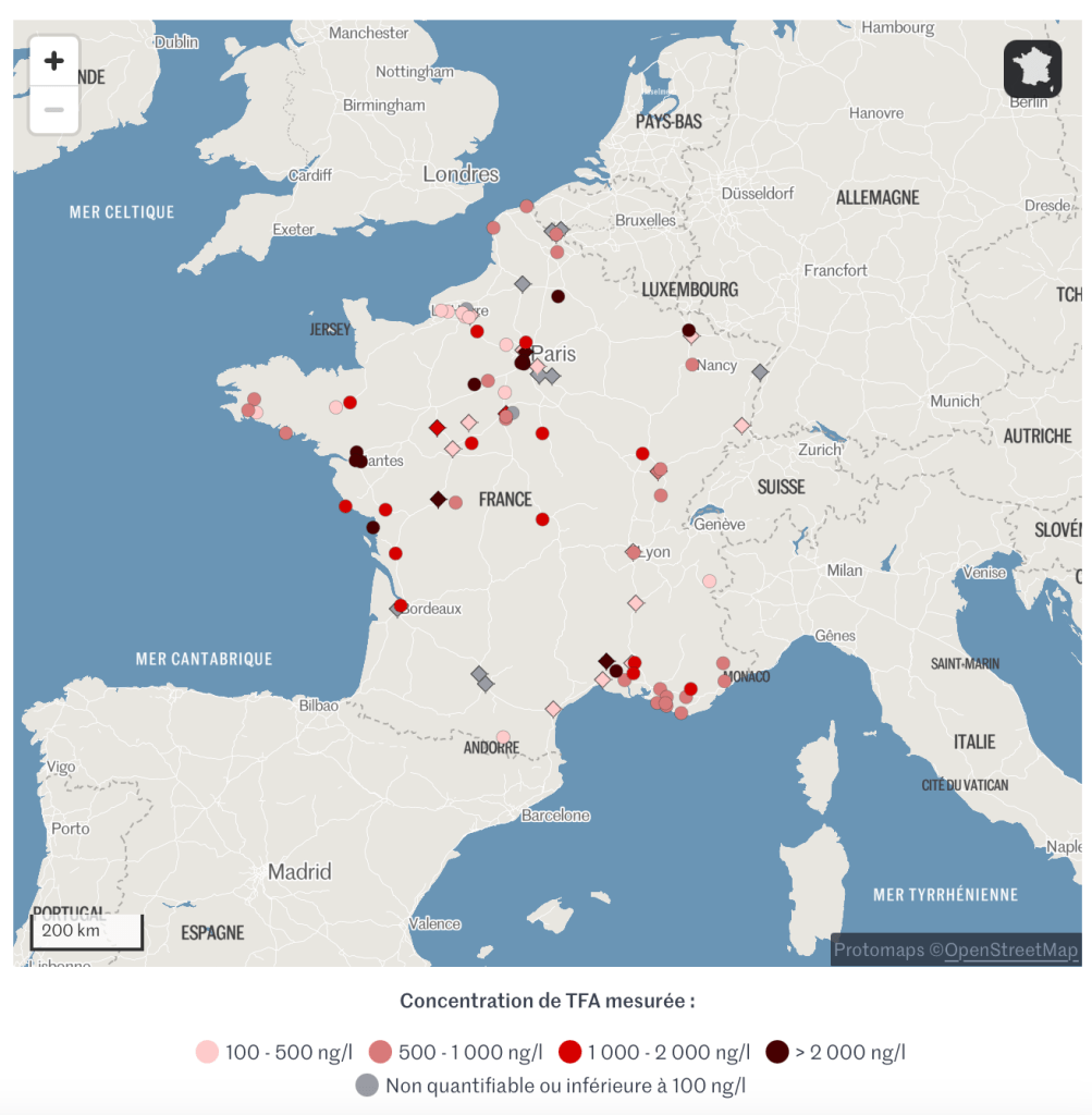Au total, le TFA a été détecté dans 24 des 30 prélèvements réalisés par l’UFC-Que choisir et Générations futures, et au-dessus de 100 ng/L dans 66 % des échantillons. Hormis Paris, d’autres agglomérations sont concernées mais à des niveaux moindres : Fleury-les-Aubrais (Loiret), près d’Orléans (1 600 ng/L), Lille (290 ng/L), Rouen (250 ng/L), Metz (230 ng/L), Mulhouse (140 ng/L)…