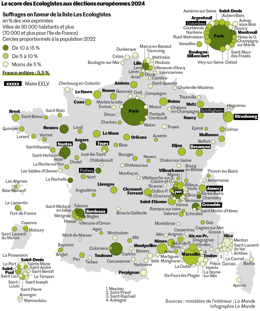 Aux européennes du 9 juin 2024, les écologistes n’ont rassemblé que 5,5 % des suffrages. Et le vote pour leur liste a perdu une dizaine de points depuis 2019 dans les grandes villes dirigées par les Verts. Electoralement, leurs scores sont « en dents de scie. Mais, aux européennes, ils ont toujours eu de bons résultats », constate Daniel Boy, directeur de recherche émérite au Centre de recherches politiques de Sciences Po. Comment expliquer la contre-performance de 2024 ? A gauche, « ils ont perdu le monopole [de l’écologie], explique M. Boy. Jean-Luc Mélenchon a commencé à en parler de manière sérieuse, puis les socialistes. Il y a aujourd’hui une quasi-unanimité sur l’écologie et c’est un problème pour les Verts, qui étaient seuls sur cette question. »