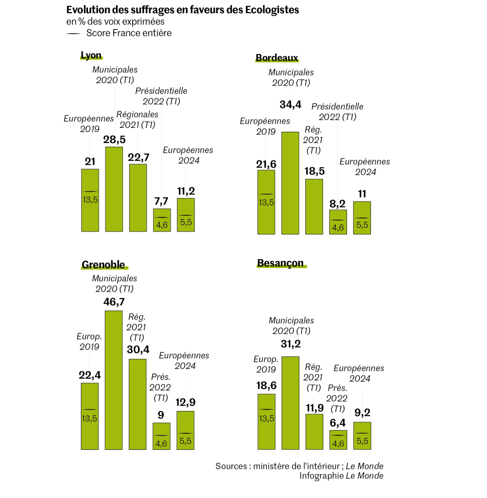 Et ce d’autant plus que le contexte des dernières élections a changé. En 2020, le scrutin avait été marqué par la crise sanitaire, dans ses modalités (le second tour avait été retardé de trois mois), mais aussi par les questions soulevées par la pandémie de Covid-19 : comment appréhender le « monde d’après » ? En outre, les municipales s’étaient déroulées dans la foulée des européennes de 2019, lors desquelles la liste Europe Ecologie-Les Verts était arrivée en troisième position, avec 13,48 % des voix. Un sommet, rappelle M. Teinturier. Aux municipales, poursuit-il, « ils avaient alors d’autant plus performé qu’ils avaient le vent dans les voiles. Aujourd’hui, on assiste à la poussée d’un discours antiécolo, antinormes… Les écologistes ont bien moins la cote ».