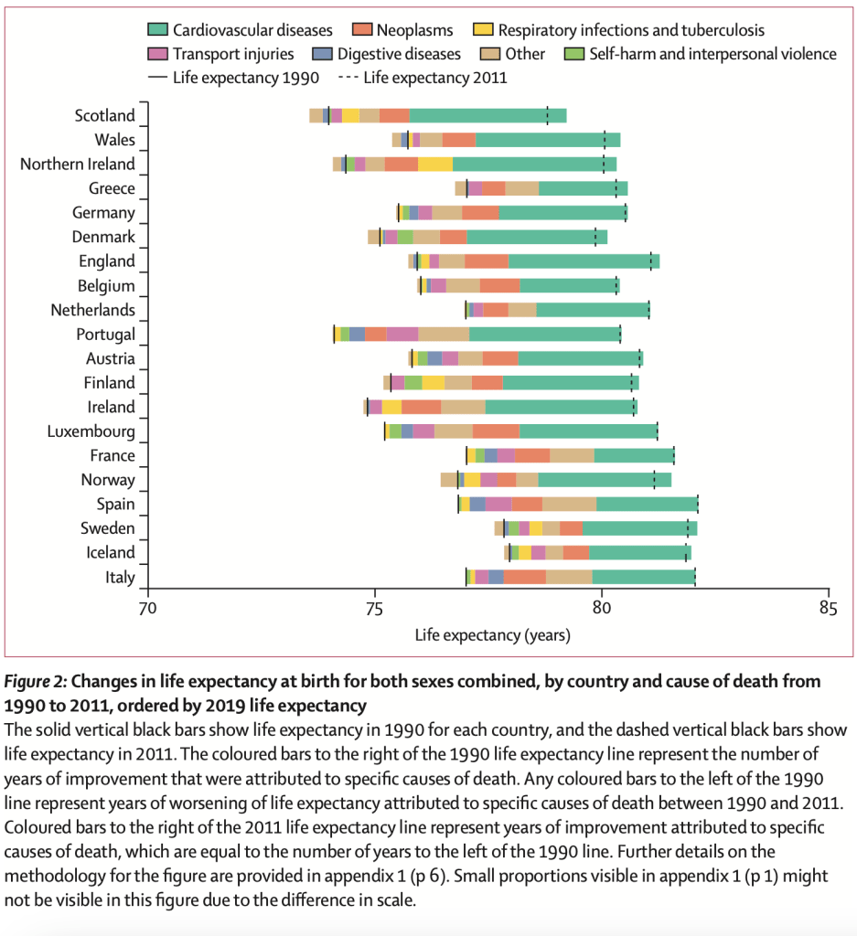 Tous ces pays ou nations ont connu une hausse annuelle de leur espérance de vie entre 1990 et 2011 de 0,23 an en moyenne, avec des variations allant de + 0,3 an pour le Portugal à + 0,16 an pour la Grèce en passant par + 0,22 an pour la France. Mais tous ces pays présentent un ralentissement de la hausse de l’espérance de vie entre 2011 et 2019, à l’exception de la Norvège, où l’espérance de vie a augmenté de 0,21 an par an entre 1990 et 2011 et de 0,23 an entre 2011 et 2019. L’Angleterre a connu le plus fort ralentissement, puisque l’espérance de vie y a augmenté de 3 mois par an entre 1990 et 2011 et a quasiment stagné (+ 0,07 an par an) entre 2011 et 2019.