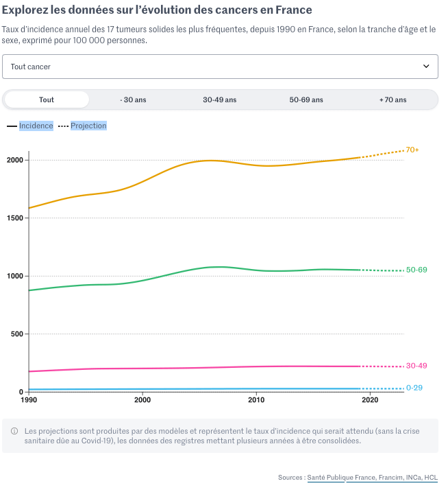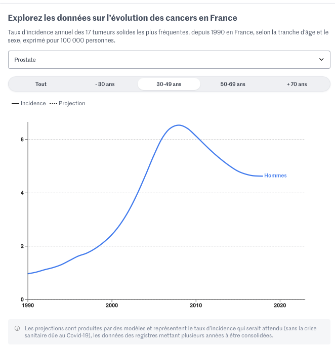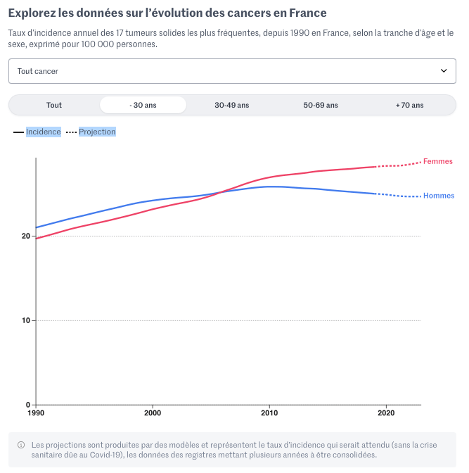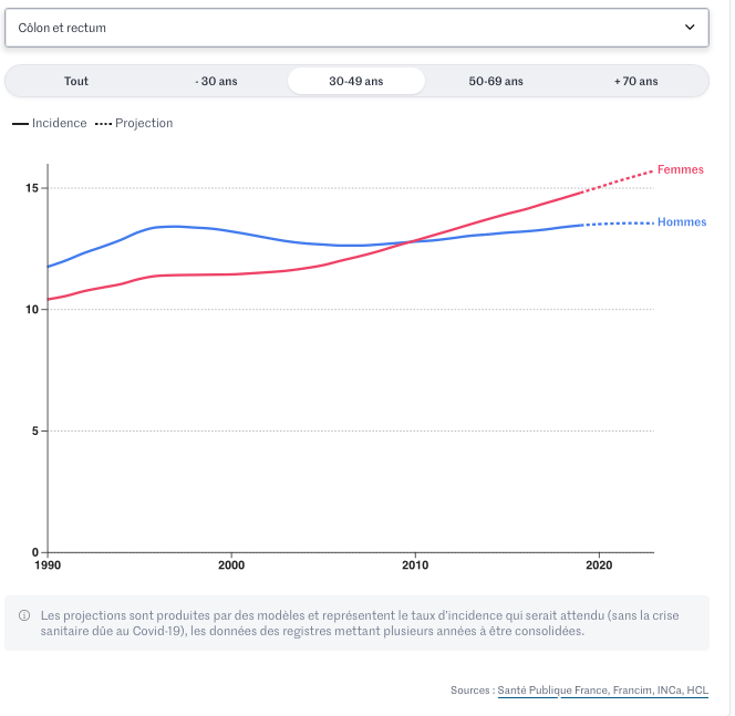 Quid de la France ? Si la prudence reste de mise, du fait d’effectifs modestes dans les tranches d’âge jeunes, les statistiques nationales semblent confirmer cette tendance pour plusieurs tumeurs, comme le montrent les données traitées par Le Monde. Ce travail s’est appuyé sur les données du réseau Francim, qui travaille en collaboration avec SPF, l’INCa et les Hospices civils de Lyon.