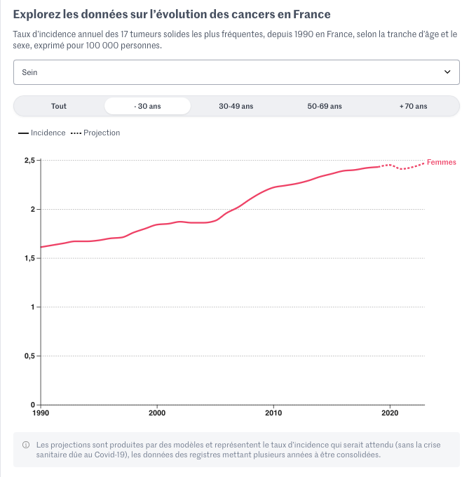Chez les moins de 50 ans, le nombre de nouveaux cas est, lui, passé de 7 642 en 1990 à 11 754 en 2023. Or, les femmes jeunes sont plus susceptibles de développer un cancer du sein plus agressif, au pronostic plus défavorable.