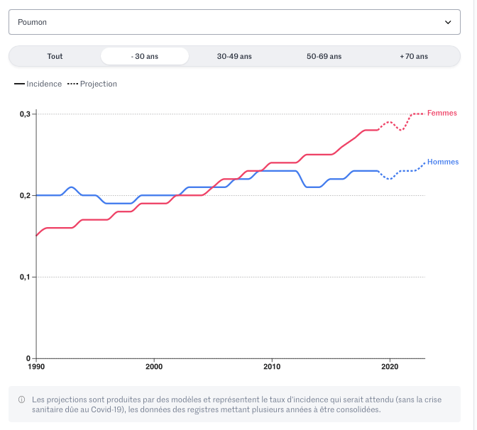 Du moins chez les hommes. Chez les femmes, où le tabagisme a été historiquement plus tardif, l’incidence est encore en augmentation dans de nombreux pays. C’est le cas de la France, où l’incidence (en taux standardisé sur la population mondiale) a diminué de 0,5 % en moyenne par an entre 2010 et 2023 chez les hommes, alors qu’elle a progressé de 4,3 % en moyenne par an chez les femmes.