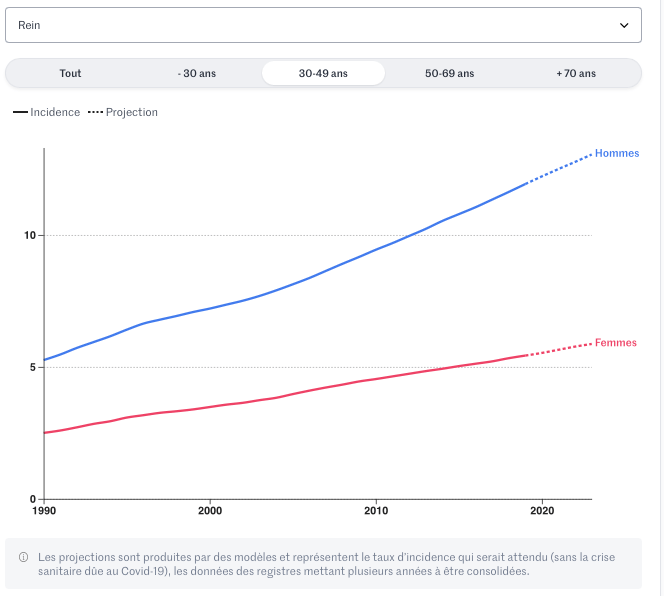 Concernant les cancers colorectaux (hors appendice), on observe une augmentation de 1,43 % par an, un phénomène constaté à l’échelle internationale, avec une agressivité accrue chez les jeunes patients. Les cancers du rein progressent de 4,51 % par an. Les épidémiologistes attribuent l’augmentation de ces 2 cancers à l’obésité, sans certitude toutefois.