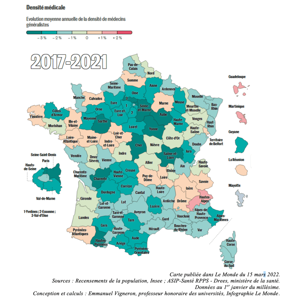 Pour la CSMF, elles représenteraient 83% du territoire, et donc il n’y aurait que 17% de zones sur-dotées. En réalité les études de démographie médicale du Pr Vigneron montrent qu’entre 2017 et 2021 , 14 départements ont vu une stabilité de leur densité en médecins généralistes, 16 une augmentation. Il n’y a donc que 56 départements qui ont vu une baisse de leur densité soit 65%.
