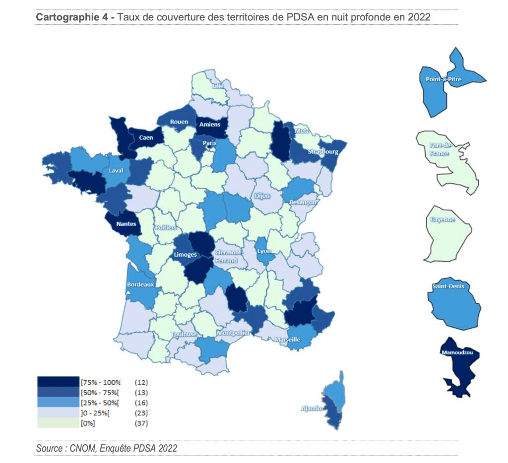 La couverture la nuit ne dépasse 75% des territoires de santé du département que dans 10 départements. Il y a « 90% des zones blanches » sur l’ensemble du territoire.