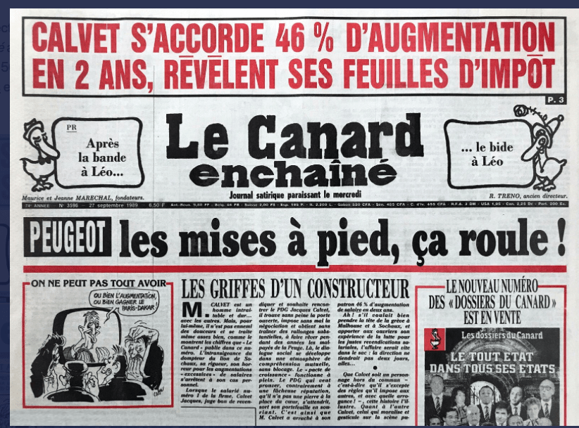 Les plus anciens lecteurs se souviendront du « scandale Jacques Calvet » de 1989, quand le Canard enchaîné avait révélé en pleine grève le salaire mensuel du PDG de Peugeot, en hausse de près de 50 % en deux ans : 185 000 francs de l’époque, qui représentent environ 53 000 € par mois en euros actuels. C’était environ 30 fois le salaire d’un ouvrier, contre 20 fois en 1986.
