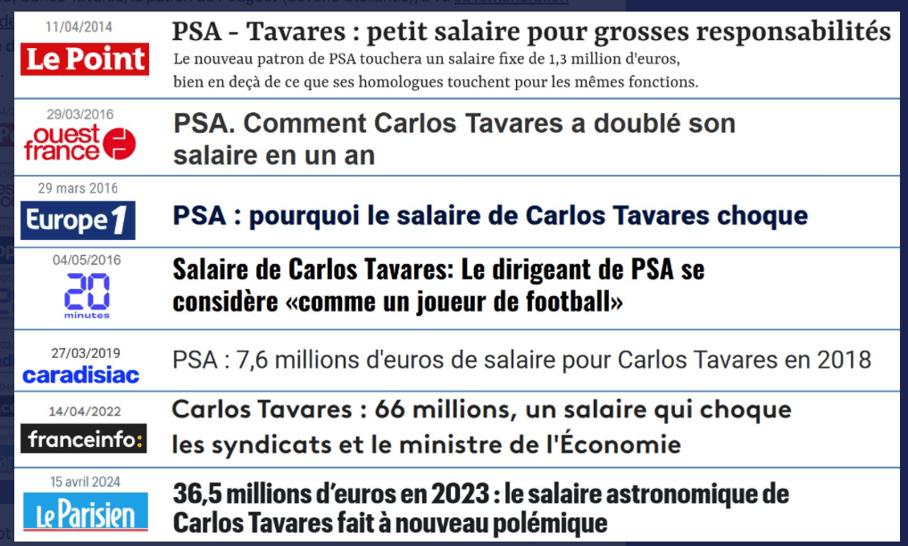 En 2023, Carlos Tavares, le patron de Peugeot (devenu Stellantis), a vu sa rémunération croître de 56 % en un an, pour se monter à 3 millions d’euros par mois, soit 2 100 fois le salaire d’un ouvrier. Le salaire relatif du PDG de Peugeot a donc été multiplié par 100 en 35 ans.